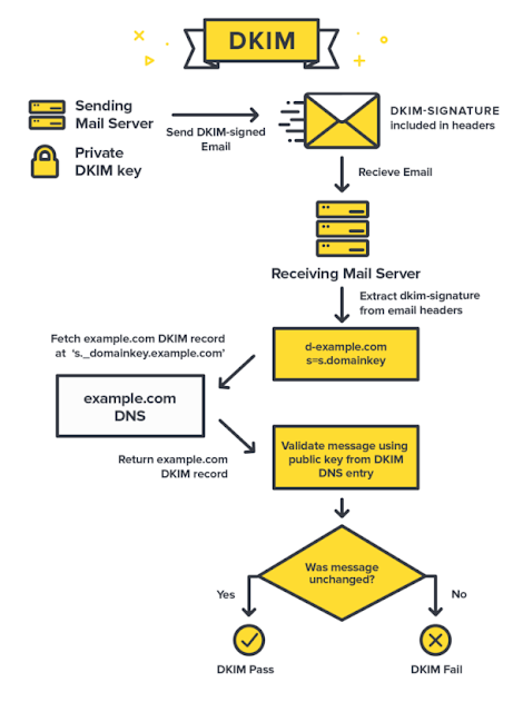 This protocol was intended to overcome the limitations of the SPF protocol. SPF defines what will be the sender email's address, but it does not define if the rest of the contents delivered to the user are intact. DKIM overcomes this limitation and signs an email with a digital signature using its private key. The public key is published on the DNS in the form of a TXT record. An example of a DKIM signature in the email is